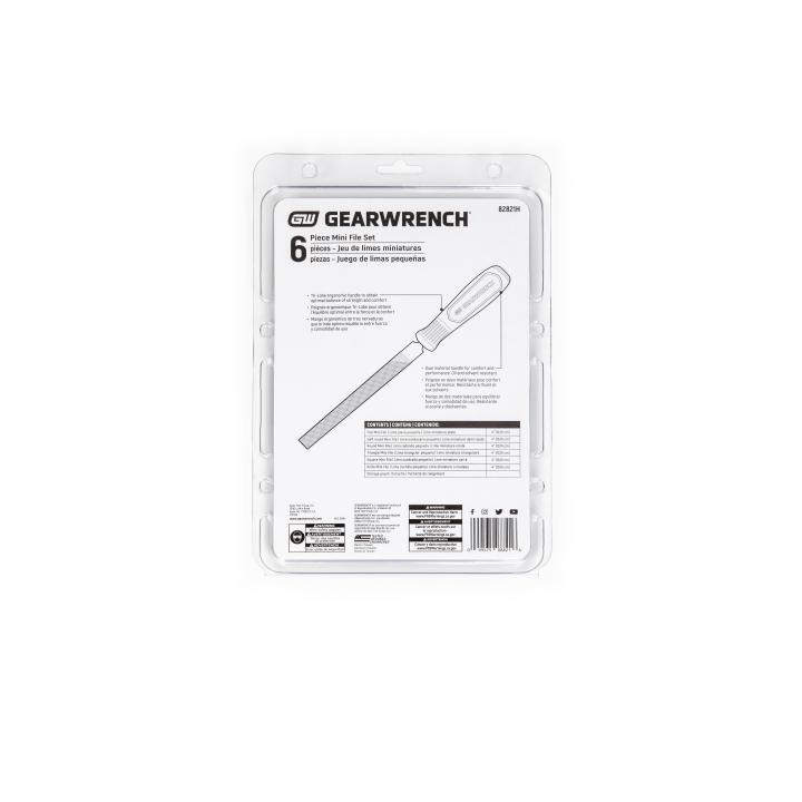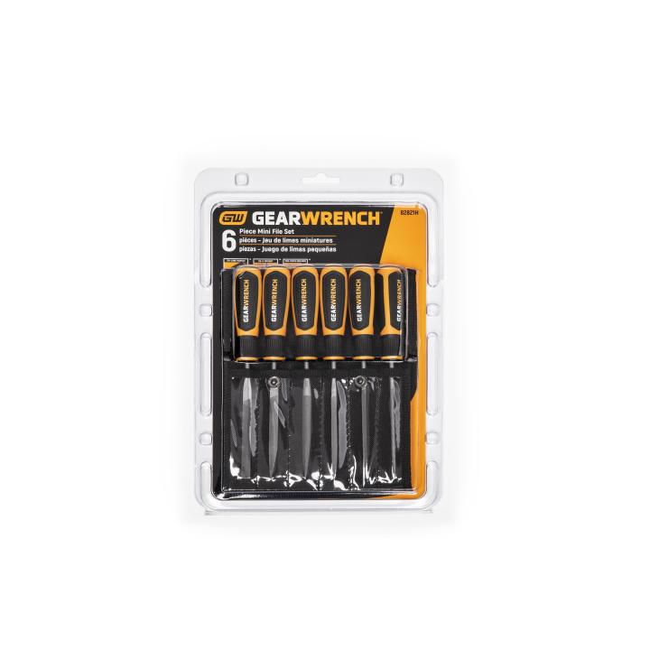 GEARWRENCH files are made from tool grade steel for strength and durability. They feature dual material ergonomic handles for added comfort and durability. The 82821 is a 6 piece mini file set consisting of 4 in. files in flat, round, half round, square, knife, and triangle which are intended for intricate filing and smoothing.