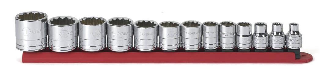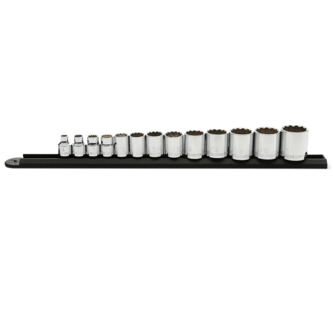 GEARWRENCH sockets are manufactured from alloy steel for maximum durability and strength. Our off corner loading design reduces fastener rounding and the chamfered opening help guide the socket on to fasteners. The 13 piece 3/8" Drive 12 Point SAE Standard Length Socket Set includes sizes: 1/4", 5/16", 3/8", 7/16", 1/2", 9/16", 5/8", 11/16", 3/4", 13/16", 7/8", 15/16", & 1" and includes a socket rail for storage & organization.