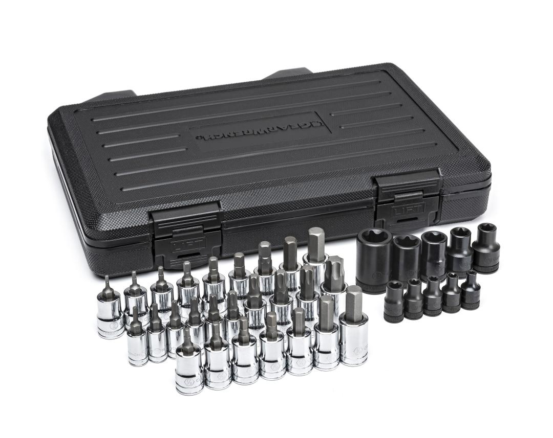 The GEARWRENCH 36 piece 1/4", 3/8", and 1/2" drive hex and Torx® bit socket set features is furnished in a durable blow mold case for storage and added organization. The bits are manufactured from S2 steel for great strength and are heat treated for durability. Each socket is hard stamped with sizes for easy identification. The set includes 6 SAE hex bit sockets from sizes 5/32" through 3/8", 10 metric hex bit sockets from sizes 2mm through 10mm, 11 Torx® bit sockets from sizes T10 through T55 and 9 External Torx® sockets from sizes E5 through E18.