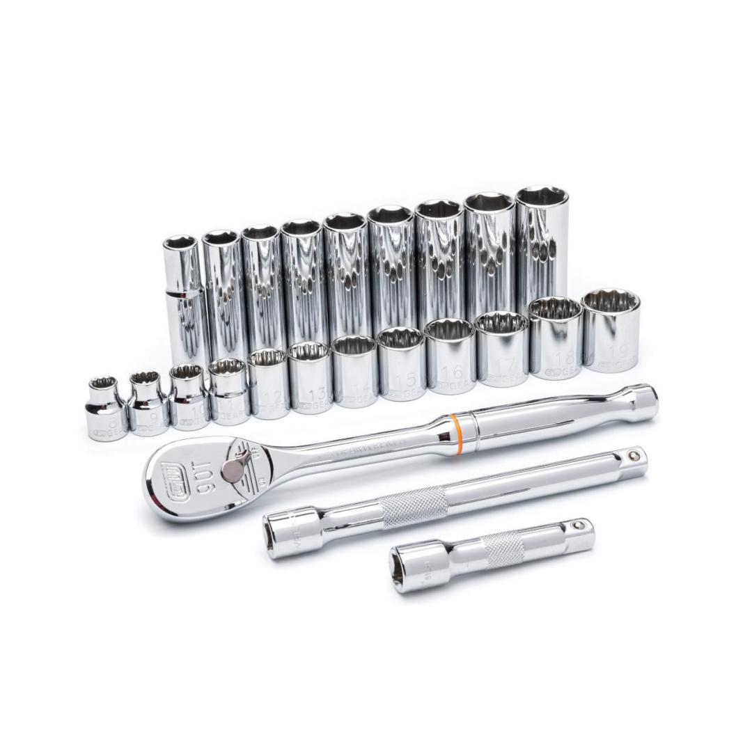 GEARWRENCH mechanics tools have all been designed with the professional user in mind to increase productivity, access, and strength. The 90 tooth ratchets, and sockets are made from premium alloy steel and feature a full polish chrome finish that resists rust and corrosion. Large, hard-stamped markings allow for easy identification. Additionally, the off-corner loading design puts force on the flats of fasteners for improved durability and reduced fastener rounding.