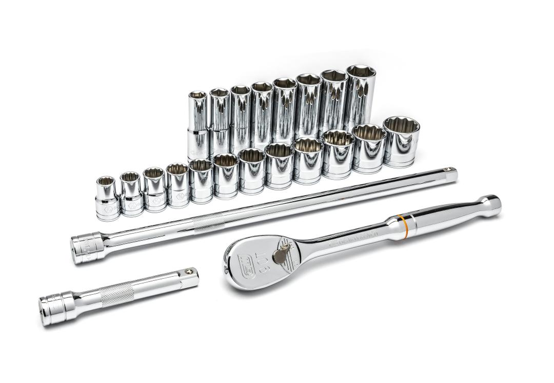 GEARWRENCH mechanics tools have all been designed with the professional user in mind to increase productivity, access, and strength. The 90 tooth ratchets, and sockets are made from premium alloy steel and feature a full polish chrome finish that resists rust and corrosion. Large, hard-stamped markings allow for easy identification. Additionally, the off-corner loading design puts force on the flats of fasteners for improved durability and reduced fastener rounding.