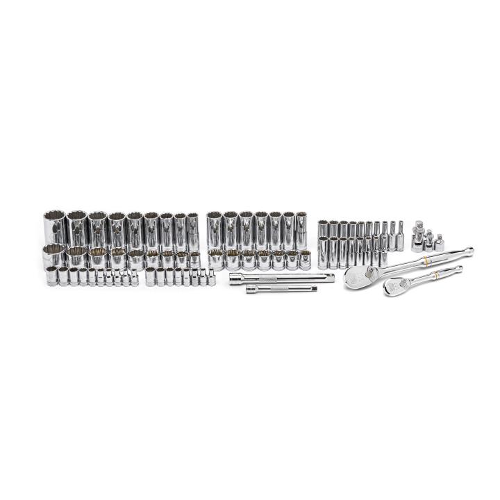 Frequently Asked QuestionsDoes this set come with a tool box?It comes with a blow mold case for storage and organization.What is in this set?The set includes 76 pieces of 1/4" and 3/8" drive 12 point standard and deep sockets in both SAE and metric sizes, 2 ratchets, 2 extensions, 2 adapters, and 2 universal joints. It is a comprehensive mechanics tool set that we'd recommend for a variety of users.How does the 90-tooth gear design perform?The 90-tooth gear design performs by providing a 4° swing arc that allows for easy turning of fasteners in tight spaces. This design is a notable feature of the socket set.What is the warranty?GEARWRENCH offers a full lifetime warranty on Mechanics Hand Tools. If you have specific warranty questions, please reach out to our dedicated Customer Service team at 877-626-3433.