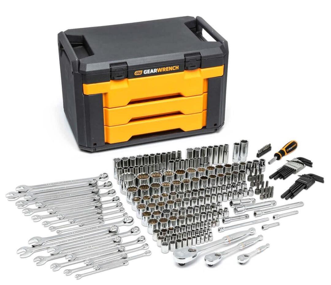 GEARWRENCH started in 1996 with the birth of the Original Ratcheting Wrench. Today the brand has continued to innovate products by adding productivity features to many product platforms. This GEARWRENCH 239-piece Mechanics Tool Set offers 1/4, 3/8 and 1/2-inch drive sizes. Featuring 90-Tooth full polish chrome ratchets and extension bars with a chamfered female end with angled entry guides smoothly and quickly onto drive tools . Full polish chrome makes clean-up easy. Sockets and wrenches feature off corner loading technology to reduce fastener rounding. All tools are stored in a 3-drawer storage box with independent sliding drawers. Side flaps are used to lock the drawers in place and has a steel hinged lid and durable handles.