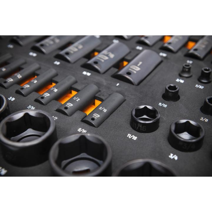 GEARWRENCH mechanics tools have been designed with professional users in mind for better productivity, access, and strength. The 63 piece 1/4”, 3/8”, 1/2” drive 6 point SAE impact socket set in a foam storage tray is one of the wide collection of GEARWRENCH Modular Sets. These chemical and solvent resistant foam trays are designed to fit in a wide range of tool storage systems, including our line of storage products. The foams are in contrasting orange and black with high visibility size markings for easy tool identification. Each of the tools fits in a custom cutout that provides optimal protection, organization, and accessibility.