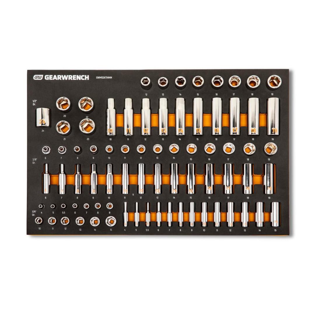 Frequently Asked QuestionsWhat are modular foam tool trays?GEARWRENCH Modular Sets feature premium quality tools organized in sturdy foam storage trays. These chemical and solvent resistant trays are designed to fit in a wide range of tool storage systems, including our line of storage products. Foams are in contrasting orange and black with high visibility size markings for easy tool identification. Each of the fine tools nests in a custom cutout that provides optimal protection, organization, and accessibility.Do GEARWRENCH modular sets fit all GEARWRENCH tool boxes?GEARWRENCH Modular Sets are in Standard Large or Standard Small Size. 2 of the Small Modulars equal the size of 1 Large Module. It is very easy for mechanics to visualize how they can organize their tool boxes with these Modular Sets. They are designed to fit in a wide range of tool storage systems, including our own line of Storage products. GEARWRENCH Modular Sets Brochure provides compatibility Chart for easy reference.What tool storage do you recommend for a mobile mechanic so I can easily transport my modular sets?GWMP100 is the perfect Heavy Duty Tool Carrier that can easily transport the Modular Sets. It allows users to perform their jobs anywhere. The military-grade water-proof, air-tight, and built-in casters features make it Land and Air Transportation friendly.What types of modular sets does GEARWRENCH offer?Mechanics Hand Tools Sets, Drive Tools Set, Wrenches, Sockets, Impact Sockets, Bit Sockets, and Bolt Biter Sets, Screwdrivers, Pliers, and MRO sets are great Modular Set Options GEARWRENCH offers to professional users. The menu continues to grow.GWMSSKTHMM is a mixed drive sizes Hi-Viz Metric socket Modular Set. What are some other Metric Chrome Sockets Modules GEARWRENCH offer?GWMSSKT12MM, GWMSSKT38MM, and GWMSSKT14MM are some GEARWRENCH signature Metric Chrome Sockets Modules.