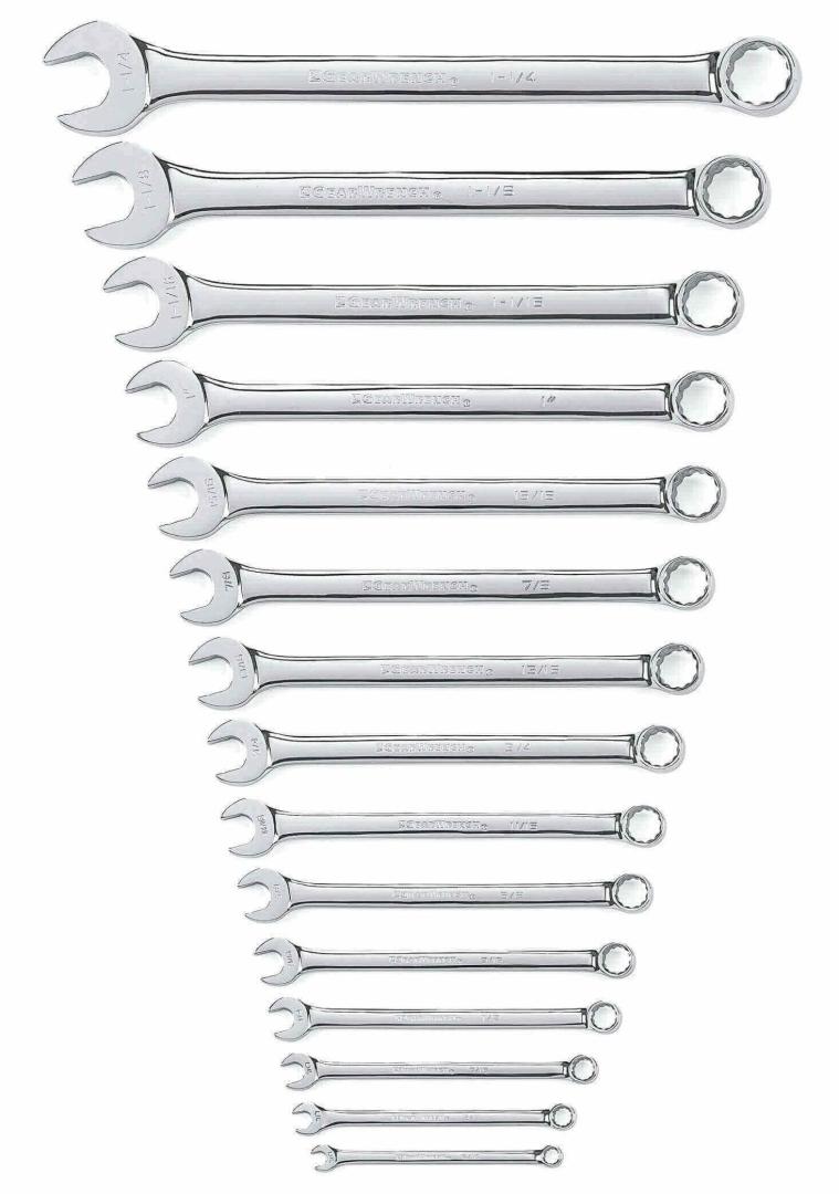 The GEARWRENCH combination wrenches are durable tools for most jobs. They are made from alloy steel with either a full polish or satin finish that resists rust & corrosion. The off-corner loading design on both ends provides a stronger grip on fasteners, reduces fastener rounding, and delivers up to 25% more torque to the fasteners. Sizes are stamped on the beam for quick, easy, & permanent identification. The box end is offset 15° for increased access to fasteners. Available in stubby & long pattern lengths and 6 & 12 point, the GEARWRENCH combination wrenches are a must have for every toolbox.