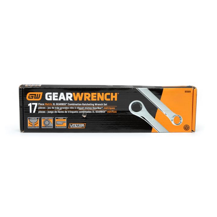 GEARWRENCH 85989 17-piece XL Gear Box Double Box End metric ratcheting wrench set consists of 1 of each 8, 9, 10, 11, 12, 13, 14, 15, 16, 17, 18, 19, 20, 21, 22, 24 and 25mm XL GearBox™ ratcheting wrenches. Ratcheting box end need as little as 5-degrees to move the fastener as opposed to 30 degrees for standard box end wrenches. The standard box end combined with the long pattern length gives this wrench excellent torque capabilities to break a stubborn, rusted fastener. The ratcheting box end then makes the loosening or tightening of the fastener fast and safe. The box end features improved box end strength from GEARWRENCH's off-corner loading and at the same time, reduces fastener rounding. The double box end ratcheting wrenches are made from the finest chrome vanadium steel for precision long lasting tool life.