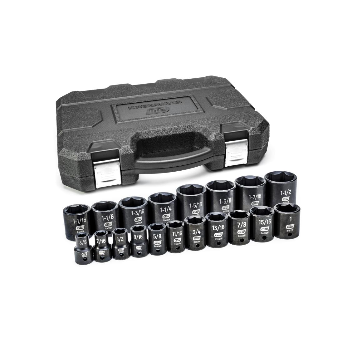 Frequently Asked QuestionsI found this set when searching online, but does GEARWRENCH offer an all metric version of it?Our most similarly sized set but with all metric standard sockets would be our part number 84933N.Do you have the sizes listed anywhere on your website?The sizes included in this set are 3/8", 7/16", 1/2", 9/16", 5/8", 11/16", 3/4", 13/16", 7/8", 15/16", 1", 1-1/16", 1-1/8", 1-3/16", 1-1/4", 1-5/16", 1-3/8", 1-7/16", and 1-1/2".Is there a set like this but with deep impact sockets?Yes, our similar set for deep impact sockets would be 84934N.Are there any impact drive tools included or do I need to purchase them separately?No, there are no impact drive tools included in this set.