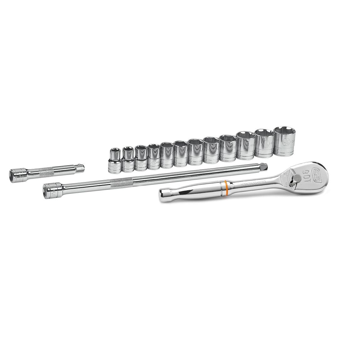 Frequently Asked QuestionsI'm looking for a set this size but with metric sockets. Does GEARWRENCH have a similar set but with metric sockets?We recommend our 80708 18 Piece 1/2" Drive 6 Point Standard Metric Mechanics Tool Set.What is included in this set?This set includes a Ratchet, 2 Extensions, 12 Standard SAE Sockets.What size sockets does it include?The socket sizes in this set are - 7/16 in 1/2 in 9/16 in 5/8 in 11/16 in 3/4 in 13/16 in 7/8 in 15/16 in 1 in 1-1/16 in 1-1/8 inWhat is the warranty?GEARWRENCH offers a full lifetime warranty on Mechanics Hand Tools. If you have specific warranty questions, please reach out to our dedicated Customer Service team at 877-626-3433.