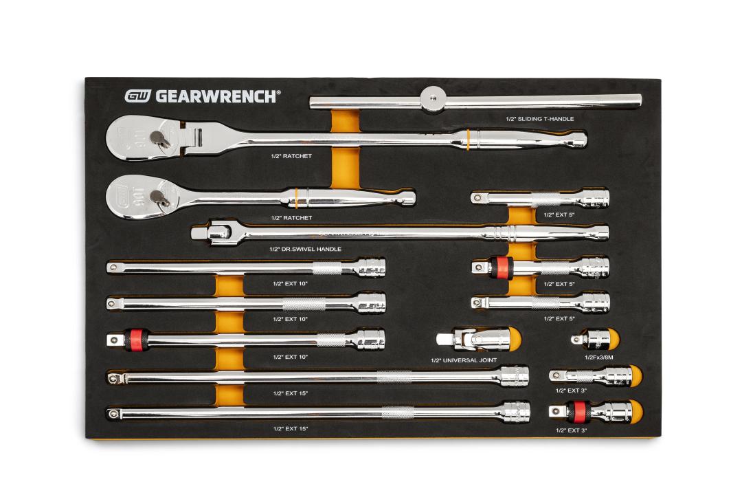 GEARWRENCH mechanics tools have been designed with professional users in mind for better productivity, access, and strength. The 16 piece 1/2" 90 tooth ratchet and drive tool set in a foam storage tray is one of the wide collection of GEARWRENCH Modular Sets. These chemical and solvent resistant foam trays are designed to fit in a wide range of tool storage systems, including our line of storage products. The foams are in contrasting orange and black with high visibility size markings for easy tool identification. Each of the tools fits in a custom cutout that provides optimal protection, organization, and accessibility.