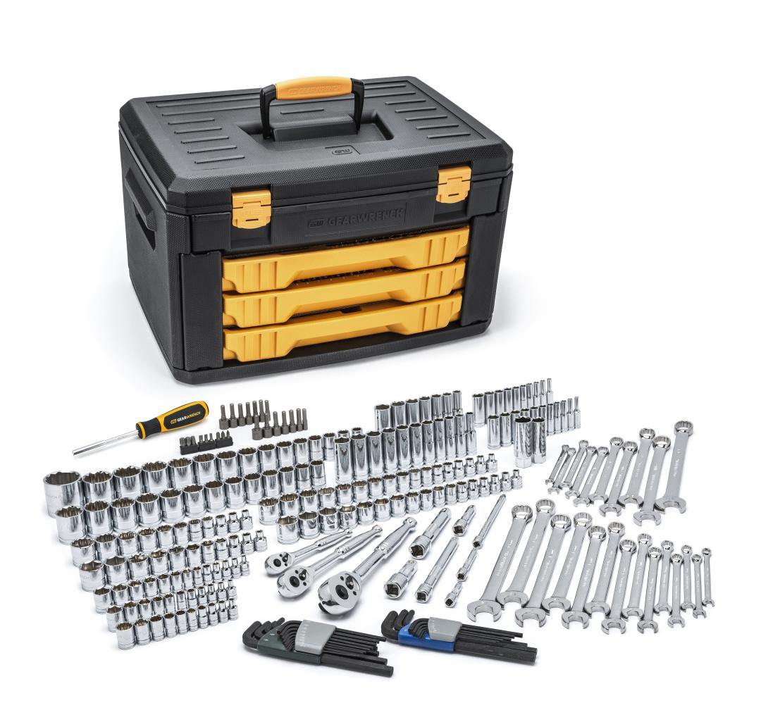 GEARWRENCH started in 1996 with the birth of the Original Ratcheting Wrench. Today the brand has continued to innovate products by adding productivity features to many product platforms. This GEARWRENCH 239-piece Mechanics Tool Set offers 1/4, 3/8 and 1/2-inch drive sizes. Featuring 90-Tooth full polish chrome ratchets and extension bars with a chamfered female end with angled entry guides smoothly and quickly onto drive tools . Full polish chrome makes clean-up easy. Sockets and wrenches feature off corner loading technology to reduce fastener rounding. All tools are stored in a 3-drawer storage box with independent sliding drawers. Side flaps are used to lock the drawers in place and has a steel hinged lid and durable handles.